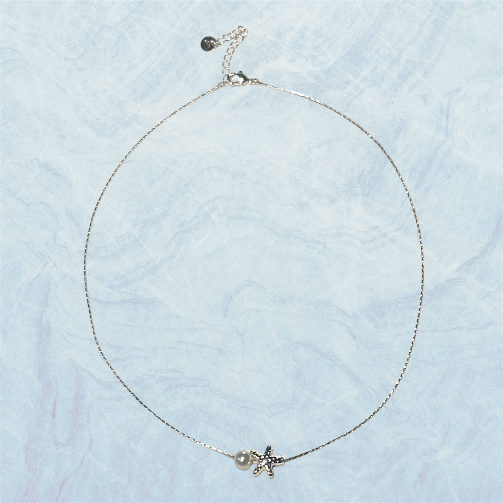 A delicate sterling silver necklace featuring a starfish charm and a single pearl accent. Light, elegant, and perfect for adding a subtle seaside touch to your look.