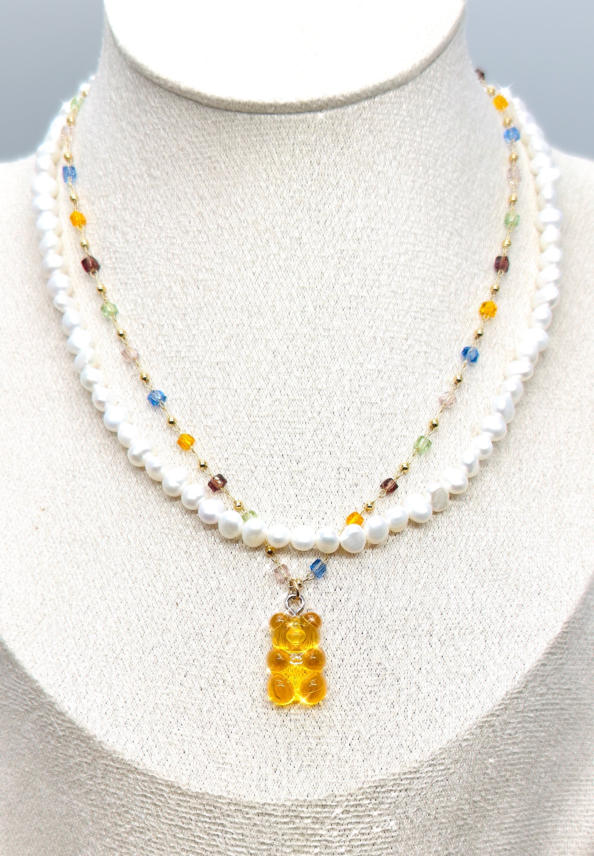 Sweet, fun and a little quirky. This necklace is made to brighten your everyday look. Freshwater pearls keep it chic and timeless while the colorful beaded strand and gummy bear pendant bring all the playful vibes. Perfect for adding a playful twist to your style or mixing with other favorites.